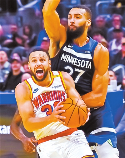 12月8日,勇士队球员库里(下)在比赛中进攻。