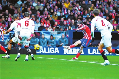 12月8日,马德里竞技队球员德保罗(右二)在比赛中射门得分。 当日,在2024-2025赛季西班牙足球甲级联赛第16轮比赛中,马德里竞技队主场4比3战胜塞维利亚队。 新华社发