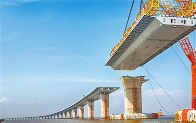 “划”出这条线并不容易。深中大桥包含两座高270米的主塔,为保证通航能力,通航净高达76.5米,为世界最大跨径海中悬索桥。悬索桥由213个梁段组成,其钢箱梁由中铁宝桥等国内造桥单位联合建造并完成高空桥位连接。