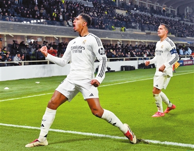 皇家马德里队球员贝林厄姆(左)在比赛中庆祝进球。 新华社发