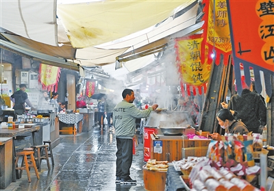 日前,浙江省兰溪市游埠古镇,游客在早茶街买小吃。