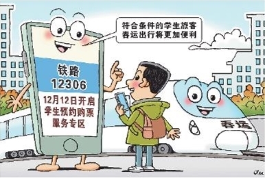 记者从中国国家铁路集团有限公司获悉,铁路部门12月12日在铁路12306手机客户端开启学生预约购票服务专区,同时优化调整学生优惠票发售和查验规则,符合条件的学生旅客可通过专区预约购买春运期间往返车票,春运出行将更加便利。
