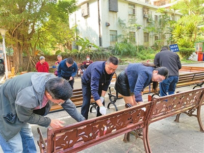经过数小时的努力,11张原本斑驳破旧的木椅焕然一新,为小区增添了一抹亮丽色彩。