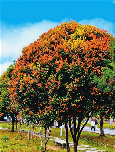 一棵红鳞树披挂着红黄绿三色彩衣,给晨光中的校园带来青春和活力。
