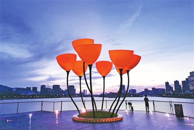 傍晚时分,市民站在观景台上观赏晚霞,亮起的红灯犹如巨大的莲蓬,美如画卷。