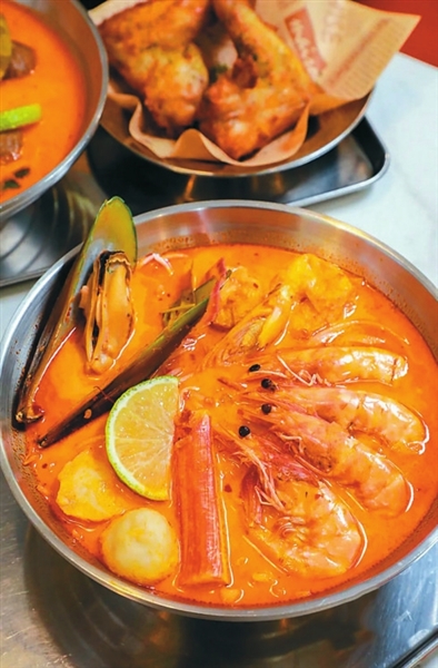 所有的餐品研发,都是安妮自己一个人动手动脑。香茅该放多少,跟其他香料的配比应该怎么把握,怎么用虾头炸出鲜香的虾油……比如,安妮很喜欢吃船面,泰国当地做法是用新鲜猪血做汤底,她思考怎样做出更能让珠海人接受的口味,遂将猪血换成了新鲜猪骨煮汤。再比如,冬阴功汤的“冬阴”是酸辣的意思,“功”则代表虾,安妮就想,酸辣虾汤里只能有海鲜吗?放点牛肉、牛肉丸、鱼丸、豆腐泡,是不是也会很搭呢?反复调试之下,安妮做出了具有自己风格的融合创新餐品。
