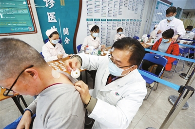“三九灸”吸引不少市民前往贴药。本报记者 程霖 摄