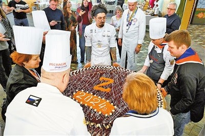 12月23日,厨师们在俄罗斯莫斯科伊兹麦罗瓦酒店举行的国际烹饪节上制作俄罗斯传统新年沙拉。这款沙拉由盐渍鲱鱼、美乃滋酱、胡萝卜、土豆等食材层叠制成。