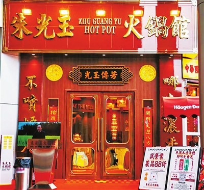 在珠海报业大厦一楼,远远就能看见朱光玉火锅馆,显眼的暗红底金字招牌,复古又气派十足。