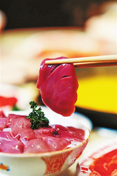 牛舌经过藤椒腌制,微麻微辣。在红锅中翻滚了一趟后,依然爽脆。厚实的口感,咬起来特别满足。