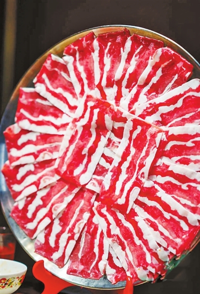 比脸还大的超大盘谷饲肥牛,有着漂亮的“大理石”花纹,极其诱人。涮锅后裹上汤汁,色泽发亮,放入口中,肥肉细嫩,瘦肉紧致,浓郁的肉香让人停不下来。