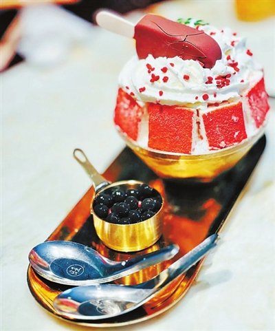 朱光玉火锅馆的甜品非常令人惊艳,无论是卖相还是味道,都比得上正宗甜品店。红丝绒芝士牛乳冰是这里的“网红”产品,冰沙顶上插着一根浓郁的草莓味梦龙冰棍,粉红色的酸奶块包裹着冰沙,糯叽叽的芋圆拌着牛乳味冰沙,酸酸甜甜、绵滑冰爽,太美味了!