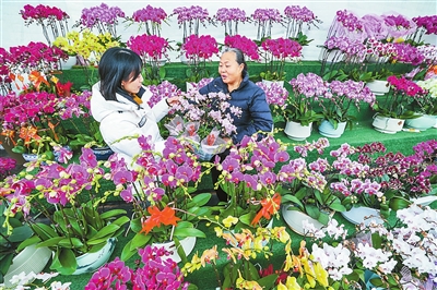 12月25日,澧浦花木城的商户(右)在给顾客介绍蝴蝶兰。 随着新年临近,浙江省金华市金东区澧浦花木城进入年宵花卉销售旺季。 金华市金东区是金华花卉苗木的主产区,花卉苗木栽培历史悠久,是全国花木主产区之一。 新华社发