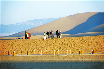 日前,游客在甘肃省敦煌市鸣沙山月牙泉景区游览。