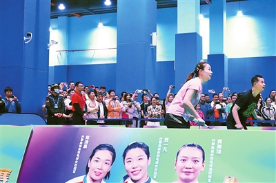 奥运冠军黄雅琼(左)在比赛现场展现了精湛的羽毛球技艺。 本报记者 朱习 摄