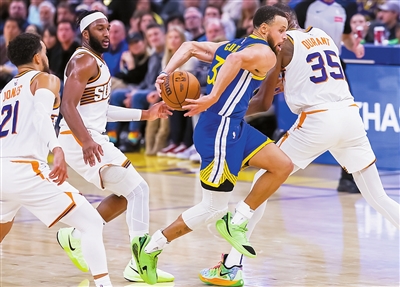 12月28日,勇士队球员库里(右二)在比赛中带球突破。 当日,在2024-2025赛季NBA常规赛中,金州勇士队主场109比105战胜菲尼克斯太阳队。 新华社发