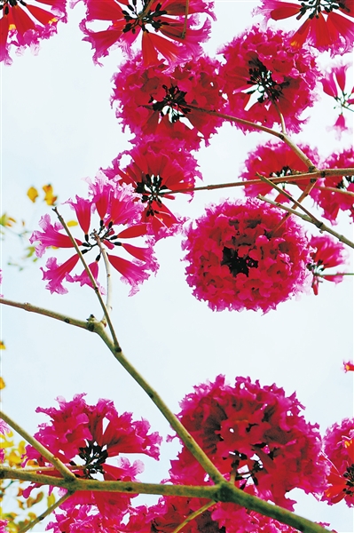 风铃木在冬日绽放,状如绣球,开满枝头。