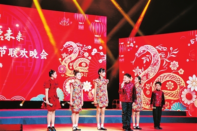舞台上,灯光璀璨,节目精彩纷呈。小演员们通过不同形式的艺术表演,展现了蛇年文化的魅力和青少年的蓬勃朝气。晚会现场还融入了丰富的互动环节,主持人与观众亲密互动,共同参与了寻宝之旅等趣味活动,使整个晚会更加生动有趣。