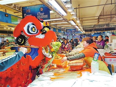 舞狮在朝阳市场为商铺“采青”招财。 本报记者 赵梓 摄