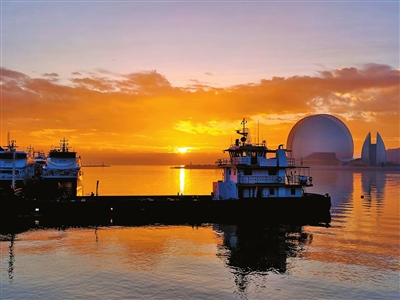 清晨,曙光初露的港口,一艘巨轮似乎装满了一船朝霞,即将起航。