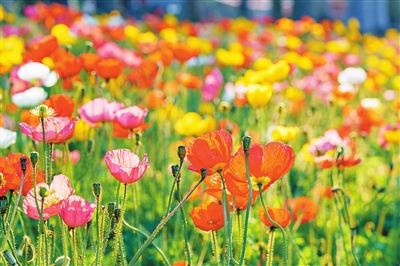 虞美人在春日的阳光下盛开,公园里五彩的花海迎接着踏春的游人。
