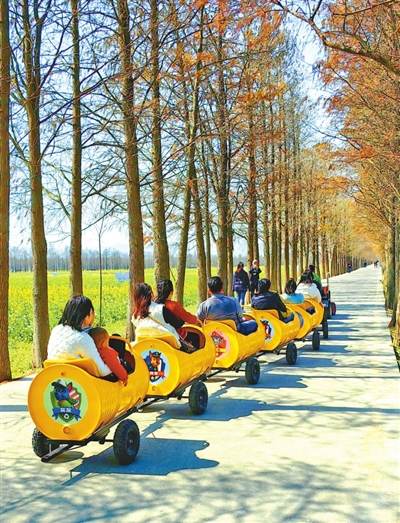 温暖的阳光照在宽敞的村道上,游客们坐着“火车”去看油菜花。