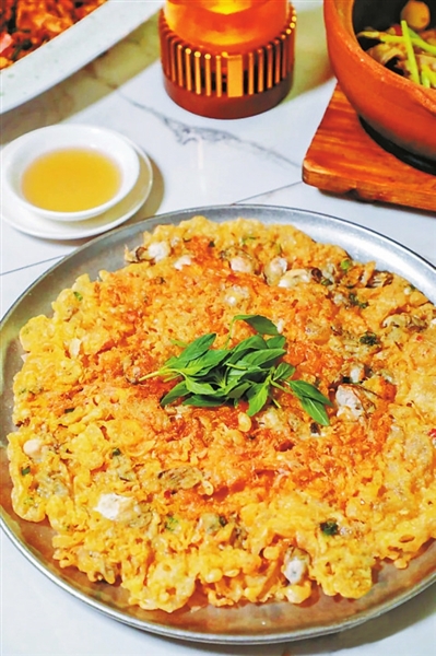 金黄酥脆的外衣下,藏着颗颗饱满的生蚝,师傅娴熟的手法和恰到好处的火候,造就了蚝仔煎外酥里嫩的绝妙口感,蘸上鱼露,大口吃进嘴里,更是香而不腻。