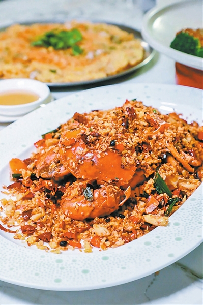 蒜末在油锅中炸至金黄色,新鲜的肉蟹轻裹生粉,锁住鲜味,再进入油锅,最后加入小米椒、豆豉爆炒,鲜、香、辣俱全的避风塘炒蟹让人忍不住竖起大拇指。