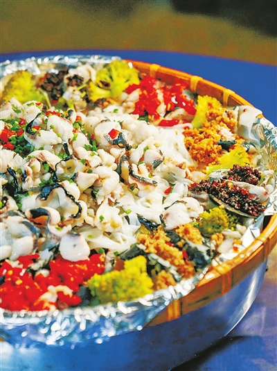 在簸箕里铺上爽滑的陈村粉和现捞切块的鸭嘴鱼头尾、骨腩,再放上剁椒、姜蓉、黄豆酱、豆豉、酸菜等多种辅料,蒸七八分钟后倒上刚刚滚熟的鱼片,浇上热油,这道菜便完成了。