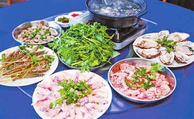 胡椒海草汤底搭配鹤洲咸水脆皮爽鱼片、九围大对虾、靓生蚝、天然海贝、农家靓土鸡,原汁原味的食材在滚烫的汤底中尽情发挥它的鲜味,冒着热气的鸡肉和海鲜蘸上酱料,入口超满足!