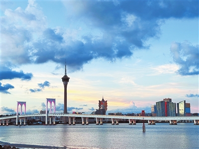 天空中,大片的云朵在暮色的映衬下染上暖色调,标志性的澳门旅游塔矗立其中,横跨水面的大桥连接两岸,与周围的现代建筑共同构成城市轮廓,呈现出澳门这座城市繁华又浪漫的一面 。