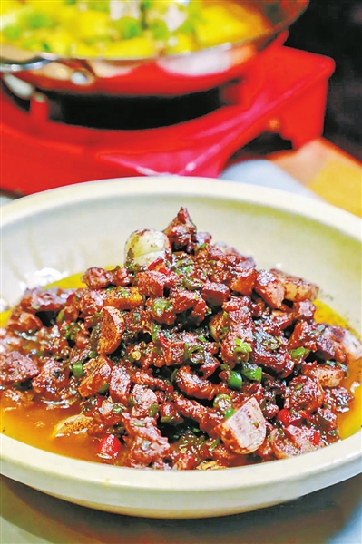 血鸭是湖南名菜,制作工序复杂,却因为开胃可口,下酒下饭,是湘菜馆里经久不衰的菜式。包裹了鸭血的鸭肉褐色油亮,到嘴里完全没有辛辣感的刺激,纯天然的辣椒素和鸭血对撞、中和,带给鸭肉别样的风味。