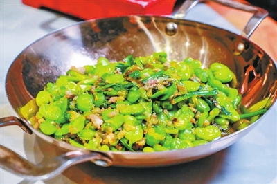 用勺子舀起来的时候,蚕豆还是粒粒分明,到了嘴里却立即化开,软软糯糯,充满豆香和肉香。