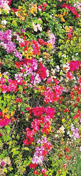 三角梅一簇簇一簇簇地开放,羊角蹄花则是满树齐开,一眼望不到尽。
