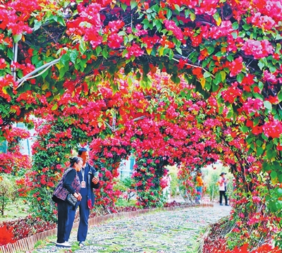 海天公园的三角梅迎来了盛花期。由多个圆型架子搭建的三角梅,此刻像是一条通往春天的时光隧道,向游人诉说着春日的浪漫故事。
