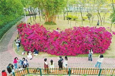 公园内大簇大簇的三角梅盛开,人们纷纷拍照打卡,记录春天的美好。