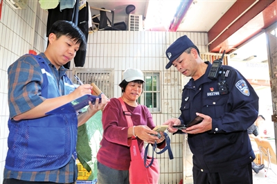 辖区民警在入户走访时开展反电诈、安全生产等宣传。 本报记者 赵梓 摄