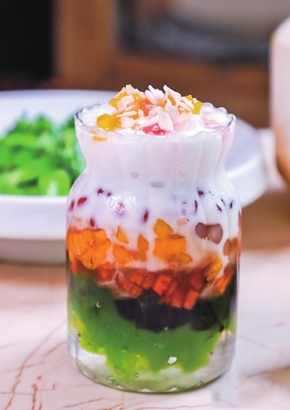 这是润鼎四季推出的夏季限定甜品。白凉粉、烧仙草、斑斓冻、红豆爆爆珠、西米等,一杯里足足有10余种小料,口感太丰富了。