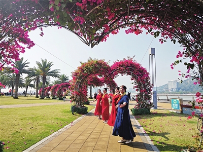 在灿烂盛开的三角梅爱心型花廊下,一群阿姨随着音乐节拍翩翩起舞,脸上洋溢着幸福的笑容。