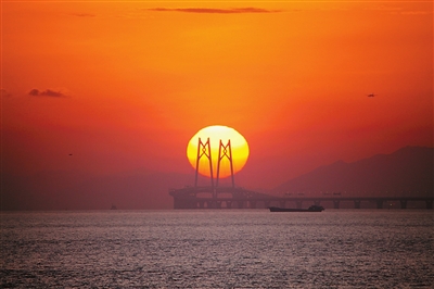 一轮红日悬于天际,将港珠澳大桥极具标志性的桥塔轮廓线条映衬得格外醒目。