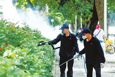 专业消杀队伍在进行作业。 本报记者 赵梓 摄