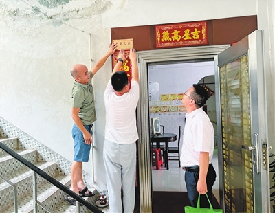 工作人员为现役军人家庭悬挂光荣牌。 朱文 摄
