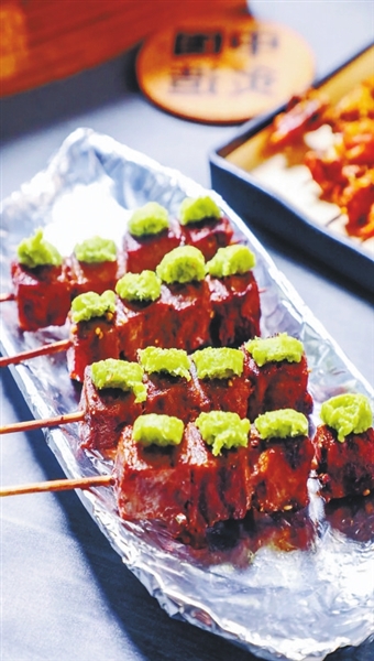 新鲜山葵现磨成酱,搭上油脂丰富的牛肉粒猛火快烤,辣度轻柔不呛鼻。