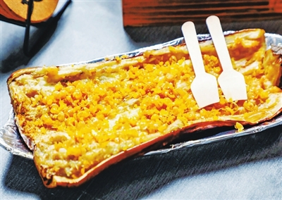 带皮茄子整个上烤架,黄油就在软糯如泥的内瓤里融化,撒上黄金豆,再加咔嚓脆响,咸香奶香一块上头!