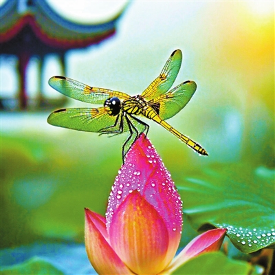 雨后天晴,蜻蜓在捕虫间隙立于荷蕾之尖,像个勇士在观察四周,随时出击。