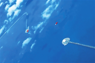 高空中俯视港珠澳大桥,海面上两个人工岛拉着“玉带”在蔚蓝大海会聚,留下的航道正让一条红色货船通过,蔚为壮观。