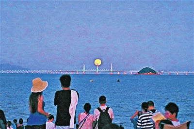 夜幕下,一轮金黄的圆月从港珠澳大桥缓缓升起,市民站在海边赏月。