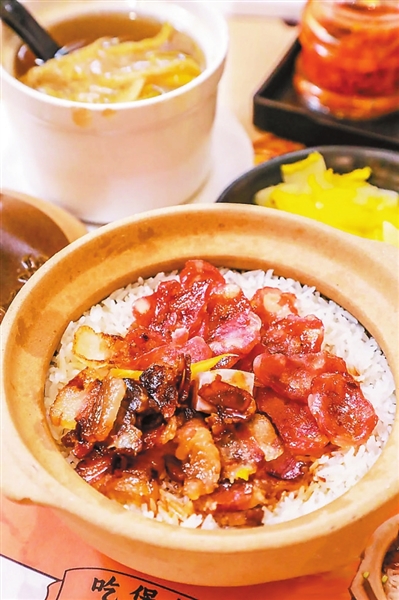 肥瘦相间的腊肉肥而不腻,用汾酒腌制的猪肉腊肠越嚼越香,配上软糯又有咬感的台山丝苗米,肉香和米香在口腔迸发!