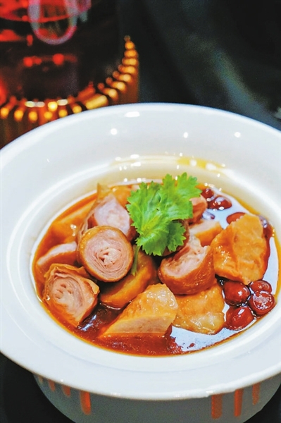 这是一道传统的闽南风味小吃,由拳头母(猪肉和肉筋制成的肉丸,形似拳头)和套肠(猪小肠层层套叠而成)组成,经卤水烹制后,风味浓郁,不油不腻。