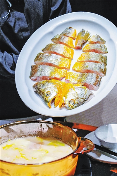 工作人员现场将鲜嫩鱼肉倒至汤中烹饪,鲜味久久萦绕不散,乳白色的汤汁醇厚浓郁,黄鱼细嫩滑溜,每一口都是海的味道。